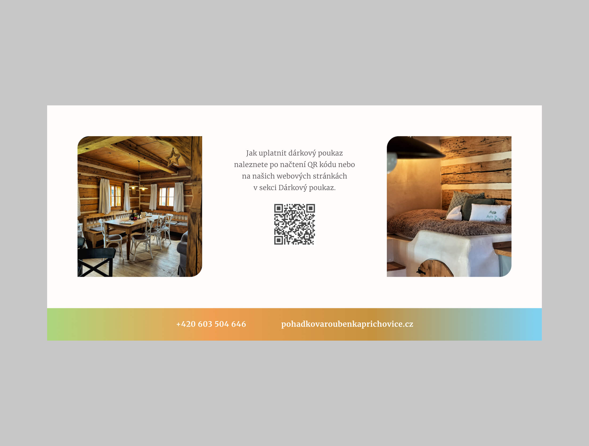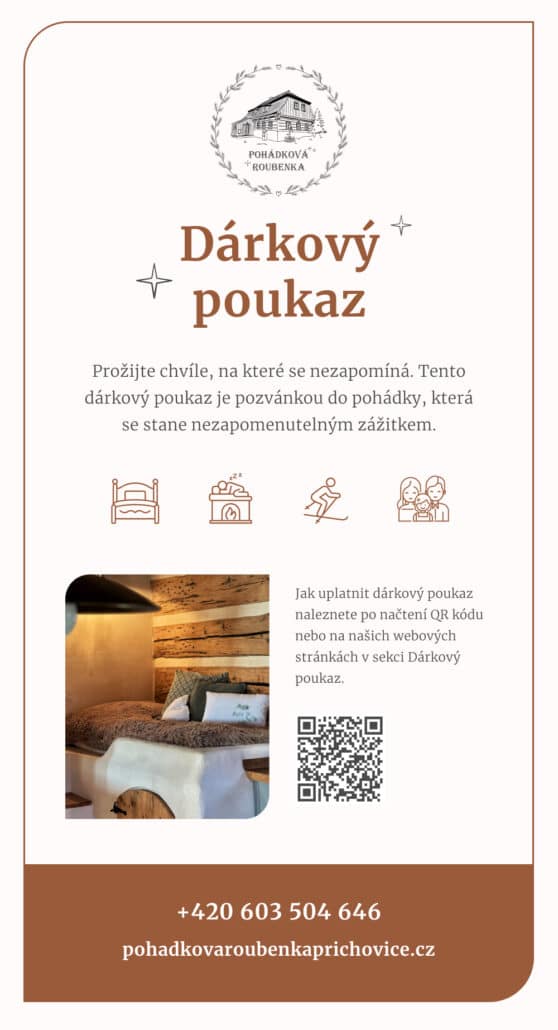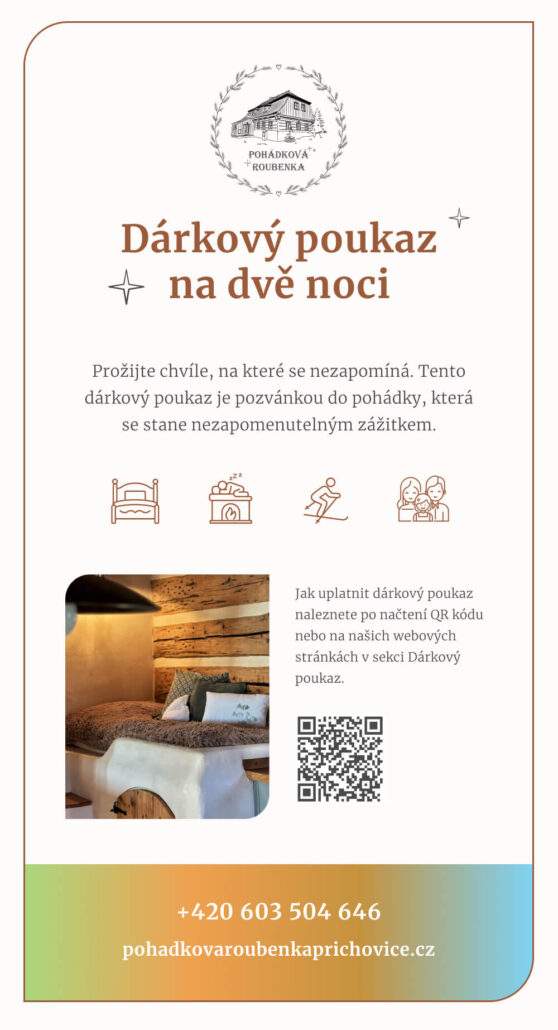 Dárkový poukaz do Pohádkové roubenky potěší rodiny s dětmi, páry i přátele. Obdarovaní si vychutnají spaní na peci, kouzelnou atmosféru dřevěné roubenky a krásy okolní přírody. Místo, kde se zastaví čas a vznikají vzpomínky, na které se nezapomíná. Již mám dárkový poukaz