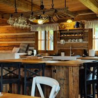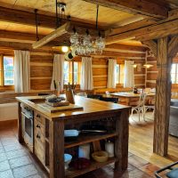 V naší roubence na vás čeká prostorná kuchyň, ve které najdete všechno, co byste mohli během pobytu potřebovat. Kuchyň je propojená s jídelní částí a obývacím prostorem s velkým gaučem a televizí. Jde o místo, kde se nejčastěji odehrávají společné chvíle. Pod televizí jsou pro děti k dispozici omalovánky, pastelky a dětské knížky.